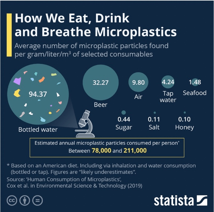 Water in plastic bottles must be avoided, as can be seen in the chart alongside as it is the greatest source of microplastics found in human organs.